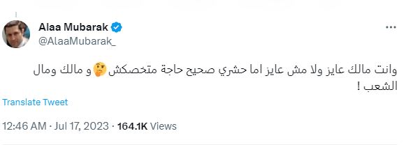 وكتب علاء مبارك على صفحته الشخصية عبر موقع التواصل الاجتماعي “تويتر”: “أنت مالك عايز ولا مش عايز أما حشري صحيح حاجة متخصكش.. ومالك ومال الشعب!”.