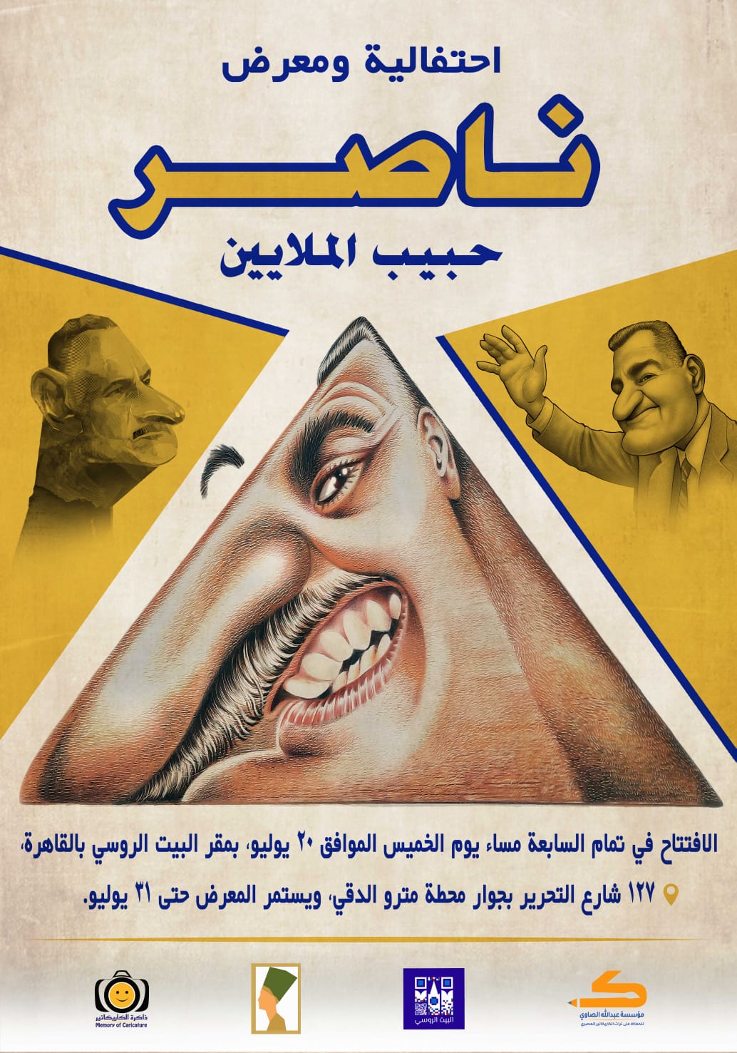 ينظم البيت الروسي بالقاهرة احتفالية ومعرض بعنوان "ناصر حبيب الملايين" بالتعاون مع مشروع ذاكرة الكاريكاتير التابع "لمؤسسة عبدالله الصاوي" للحفاظ على تراث الكاريكاتير المصري، ومدونة نفرتيتي؛ احتفالًا بالذكرى الـ 71 لثورة 23 يوليو، وقائدها جمال عبدالناصر، بقاعة المعارض بالبيت الروسي بالقاهرة في تمام السابعة مساء الخميس 20 يوليو الجاري.