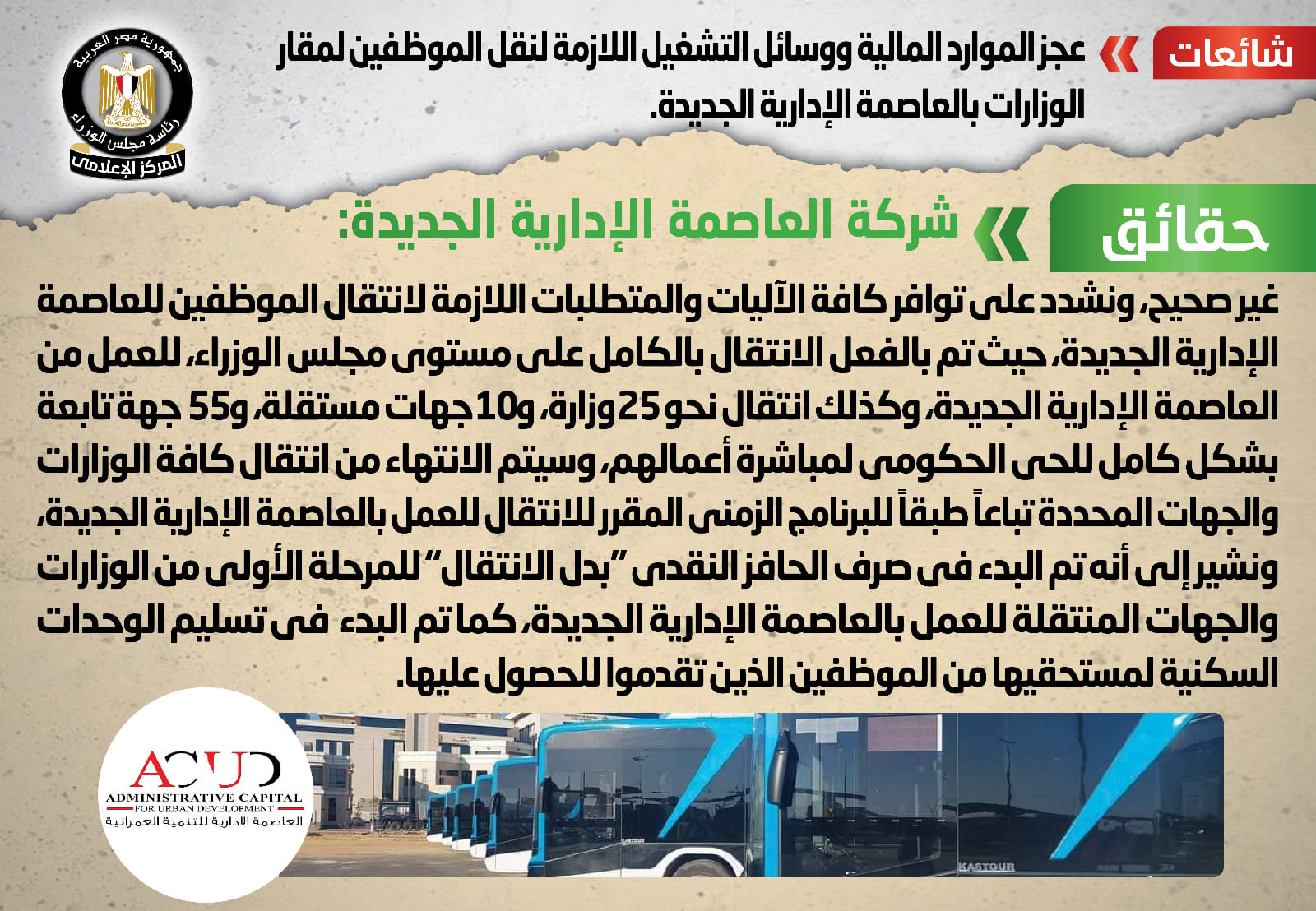 وتواصل المركز الإعلامى لمجلس الوزراء، مع شركة العاصمة الإدارية الجديدة، والتى نفت تلك الأنباء، مُؤكدةً أنه لا صحة لعجز الموارد المالية ووسائل التشغيل اللازمة لنقل الموظفين لمقار الوزارات بالعاصمة الإدارية الجديدة.