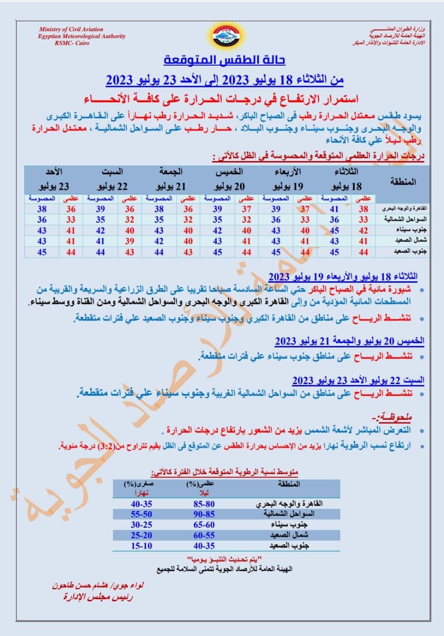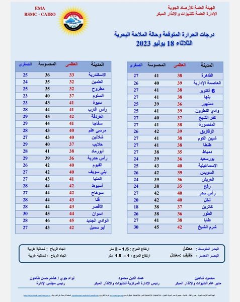 درجات الحرارة المتوقعة اليوم الثلاثاء الموافق 18 يوليو 2023