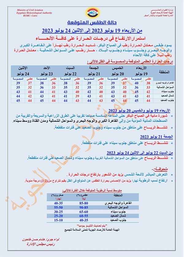 وفيما يلي بيان درجات الحرارة من الأربعاء حتى الإثنين المقبل: