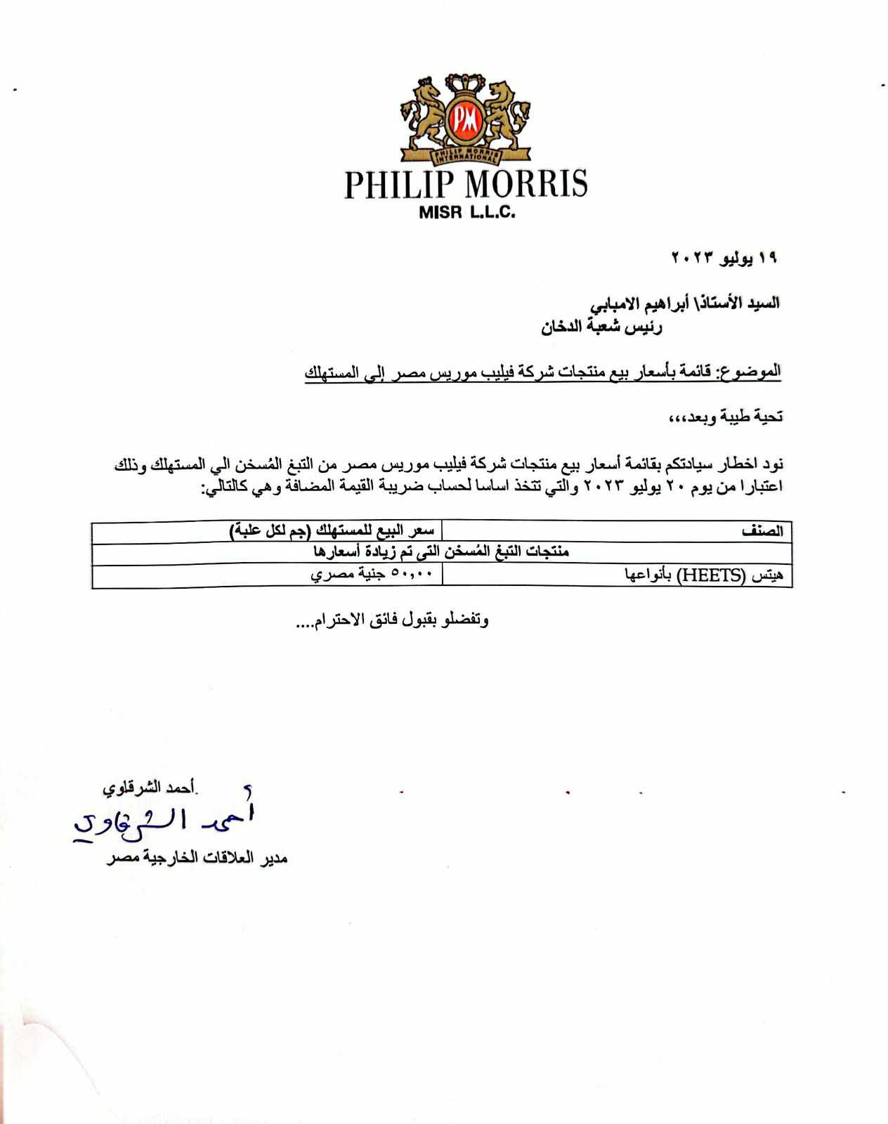 أعلنت شركة فيليب موريس مصر، في بيان لها اليوم الأربعاء، زيادة أسعار عدد من منتجاتها من السجائر بالأسواق رسميا، والتي تتضمن أصناف ميريت ومارلبورو وإل آند إم، وذلك بداية من غدٍ الخميس.