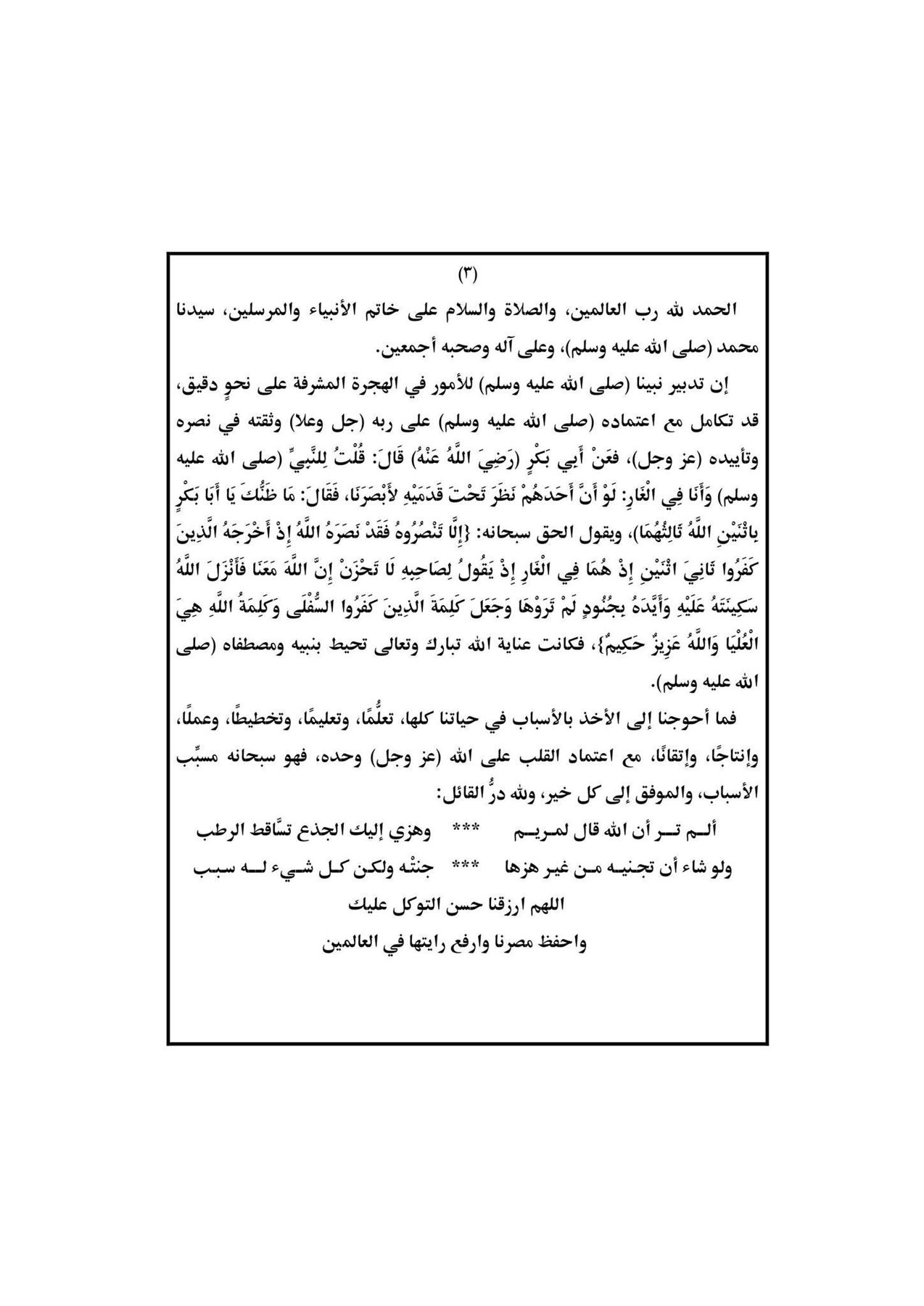 وجاءت مقدمة الخطبة التي قامت بنشرها الوزارة: الحمدُ للهِ ربِّ العالمين، القائلِ في كتابِه الكريمِ: (إِلَّا تَنصُرُوهُ فَقَدْ نَصَرَهُ اللَّهُ إِذْ أَخْرَجَهُ الَّذِينَ كَفَرُوا ثَانِيَ اثْنَيْنِ إِذْ هُمَا فِي الْغَارِ إِذْ يَقُولُ لِصَاحِبِهِ لَا تَحْزَنْ إِنَّ اللَّهَ مَعَنَا ۖ فَأَنزَلَ اللَّهُ سَكِينَتَهُ عَلَيْهِ وَأَيَّدَهُ بِجُنُودٍ لَّمْ تَرَوْهَا وَجَعَلَ كَلِمَةَ الَّذِينَ كَفَرُوا السُّفْلَىٰ ۗ وَكَلِمَةُ اللَّهِ هِيَ الْعُلْيَا ۗ وَاللَّهُ عَزِيزٌ حَكِيمٌ)، وأشهدُ أن لا إلهَ إلّا اللهُ وحدَهُ لا شريكَ لهُ، وأشهدُ أنّ سيدَنَا ونبيَّنَا مُحمدًا عبدُه ورسولُه، اللهُمّ صلِّ وسلمْ وباركْ عليهِ، وعلى آلهِ وصحبهِ، ومَن تبعَهُم بإحسانٍ إلى يومِ الدينِ، وبعدُ: