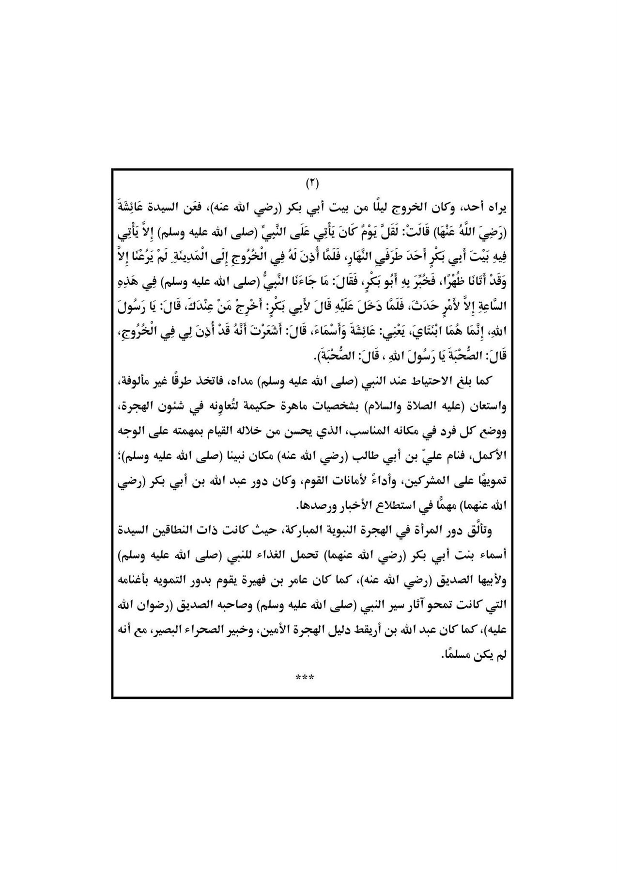 وتألقَ دورُ المرأةِ في الهجرةِ النبويةِ المباركةِ، حيثُ كانتْ ذاتُ النطاقينِ السيدةُ أسماءُ بنتُ أبِي بكرٍ (رضي اللهُ عنهما) تحملُ الغذاءَ للنبيِّ صلى الله عليه وسلم ولأبِيهَا الصديقِ (رضي اللهُ عنه)، كما كان عامرُ بنُ فهيرةَ يقومُ بدورِ التمويهِ بأغنامِه التي كانتْ تمحُو آثارَ سيرِ النبيِّ صلى الله عليه وسلم وصاحبِه الصديقِ (رضوانُ اللهِ عليه)، كما كان عبدُ اللهِ بنُ أريقطٍ دليلَ الهجرةِ، الأمينُ وخبيرُ الصحراءِ البصيرُ، مع أنّه لم يكنْ مُسلمًا.