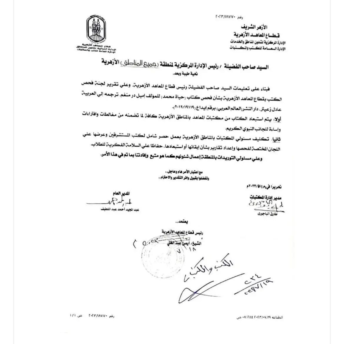 أصدر قطاع المعاهد الأزهرية، منشورًا لجميع مكتبات المعاهد الأزهرية باستبعاد كتاب "حياة محمد" للمؤلف إميل در منغم، ترجمه إلى العربية عادل زعيتر، دار النشر العالم العربي برقم إيداع (۲۰۱۲/۱۹۱۱۹).