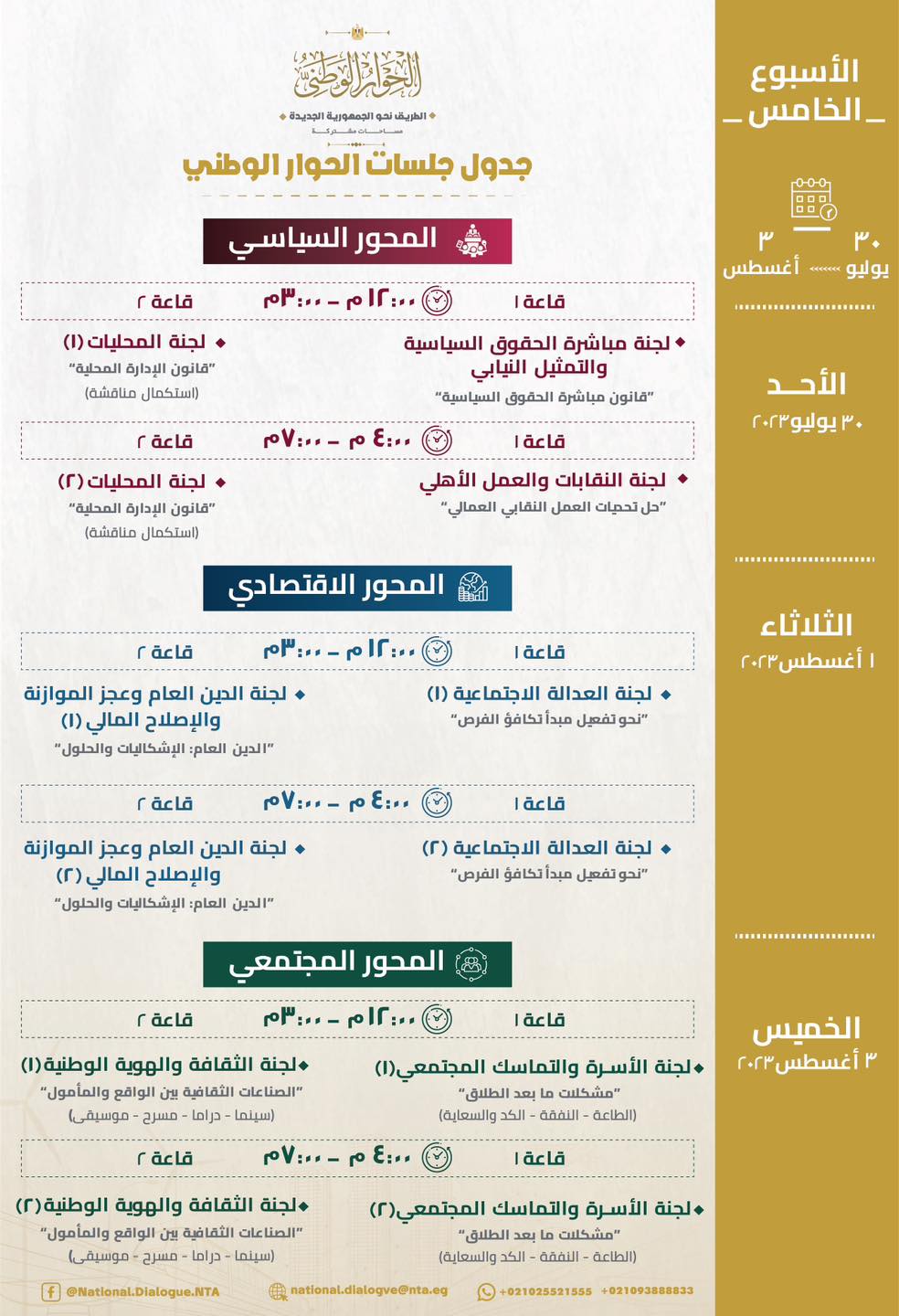 وتابعت أنه يوم 3 أغسطس تناقش لجنة الأسرة والتماسك المجتمعي المندرجة تحت المحور المجتمعي على مدار جلستين مشكلات ما بعد الطلاق (الطاعة - النفقة - الكد والسعاية)، كما تناقش لجنة الثقافة والهوية الوطنية الصناعات الثقافية بين الواقع والمأمول "سينما - دراما - مسرح - موسيقى".