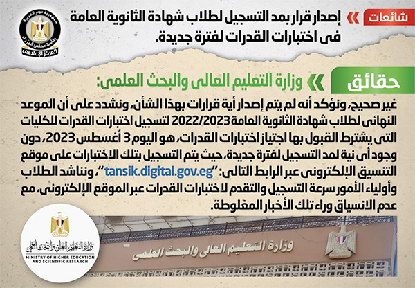 وقد قام المركز الإعلامي لمجلس الوزراء بالتواصل مع وزارة التعليم العالي والبحث العلمي، والتي نفت تلك الأنباء، مُؤكدةً أنه لا صحة لمد التسجيل لطلاب شهادة الثانوية العامة في اختبارات القدرات لفترة جديدة، وأنه لم يتم إصدار أية قرارات بهذا الشأن، مُشددةً على أن الموعد النهائي لطلاب شهادة الثانوية العامة 2022/2023 لتسجيل اختبارات القدرات للكليات التي يشترط القبول بها اجتياز اختبارات القدرات، هو اليوم 3 أغسطس 2023، دون وجود أي نية لمد التسجيل لفترة جديدة، حيث يتم التسجيل بتلك الاختبارات على موقع التنسيق الإلكتروني عبر الرابط التالي: "tansik.digital.gov.eg"، مناشدةً الطلاب وأولياء الأمور سرعة التسجيل والتقدم لاختبارات القدرات عبر الموقع الإلكتروني، مع عدم الانسياق وراء تلك الأخبار المغلوطة.
