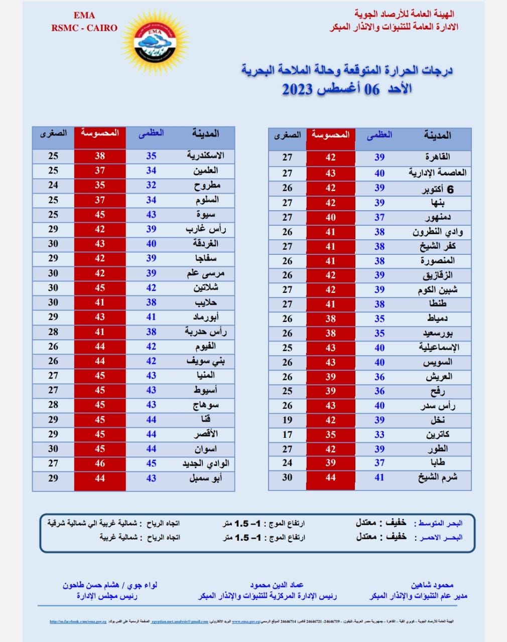 وتصل درجة الحرارة العظمي المتوقعة اليوم علي القاهرة الكبرى 39 درجة مئوية بينما درجة الحرارة المحسوسة 42 درجة مئوية.