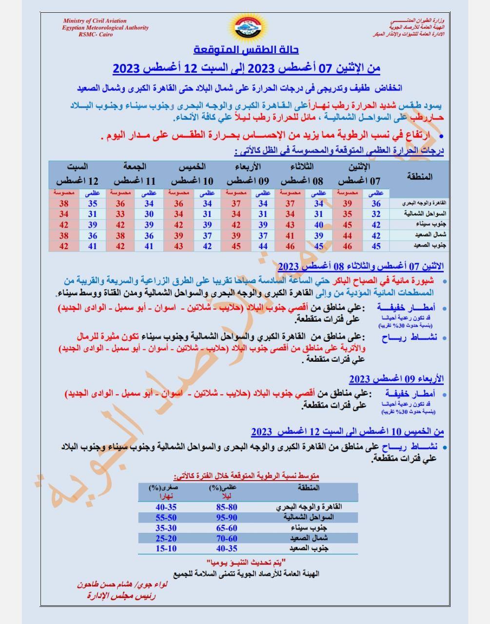 ونشرت الأرصاد بيانا بحالة الطقس اعتبارا من غد الاثنين وحتى السبت المقبل، مشيرة لطقس معتدل صباحا، وشديد الحرارة مشمس نهارا على القاهرة الكبرى والوجه البحري وشمال الصعيد، حار رطب على السواحل الشمالية، شديدة الحرارة على سيناء وجنوب الصعيد، ومعتدل على كافة أنحاء البلاد ليلا.