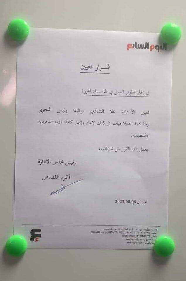 أصدر الكاتب الصحفى أكرم القصاص، رئيس مجلس إدارة مؤسسة اليوم السابع، قرارًا بتعيين الكاتبة الصحفية علا الشافعي رئيسًا لتحرير جريدة اليوم السابع.