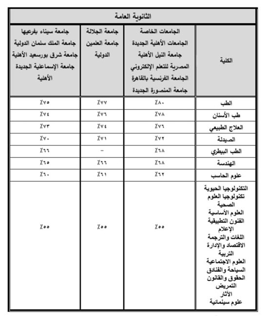 وجاءت الحدود الدنيا للتقدم للالتحاق بالتخصصات العلمية المختلفة بالجامعات الخاصة والأهلية للعام الجامعي 2023/2024 على النحو التالي: