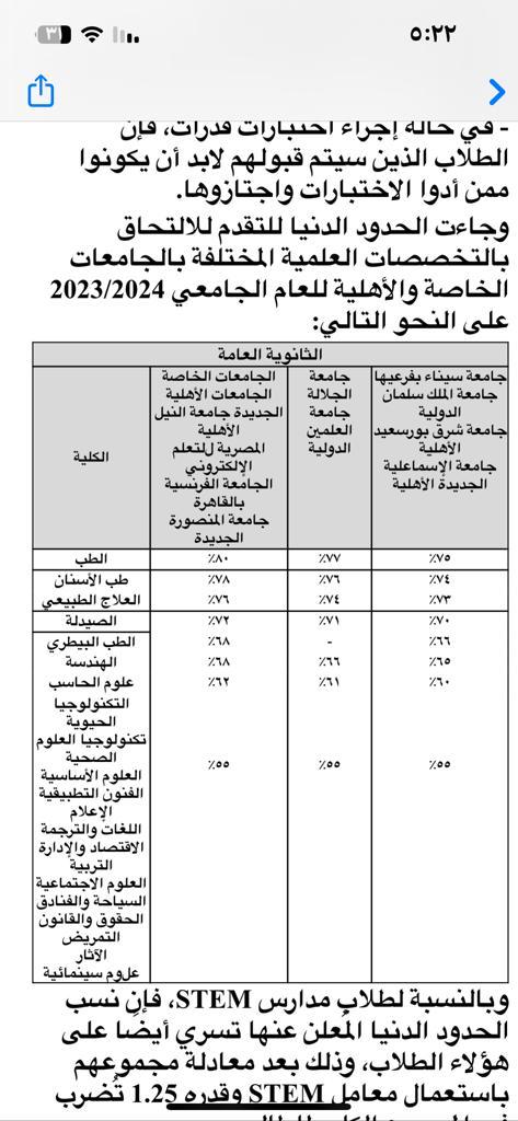 وجاءت الحدود الدنيا للتقدم للالتحاق بالتخصصات العلمية المختلفة بالجامعات الخاصة والأهلية للعام الجامعي 2023/2024 على النحو التالي: