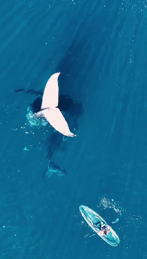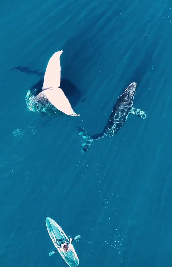 وأضاف موس: "ذيل الحوت الضخم يطفو بشكل عرضي، بلا حركة تماما، ويسبح بجواره حوت صغير".