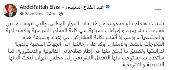 وقال الرئيس السيسي - في تدوينة على صفحته الرسمية على مواقع التواصل الاجتماعي، اليوم الأربعاء: "تلقيت باهتمام بالغ مجموعة من مُخرجات الحوار الوطني، والتي تنوعت ما بين مُقترحات تشريعية وإجراءات تنفيذية في كافة المحاور السياسية والاقتصادية والمجتمعية.. وإنني إذ أتقدم لكافة المُشاركين في إعداد وصياغة هذه المُخرجات بالشكر والامتنان، وأؤكد على إحالتها إلى الجهات المعنية بالدولة لدراستها وتطبيق ما يُمكن منها في إطار صلاحياتي القانونية والدستورية، كما سأتقدم بما يستوجب منها التعديل التشريعي إلى مجلس النواب لبحث آلياتها التنفيذية والتشريعية".