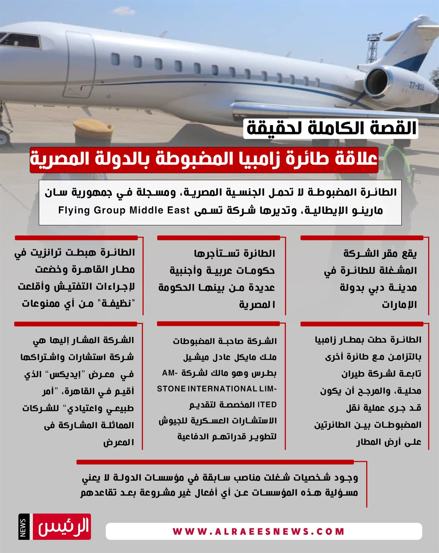 وكشفت مصادر مصرية مسئولة لموقع "الرئيس نيوز"، أن الطائرة المضبوطة لا تحمل الجنسية المصرية، ومسجلة في جمهورية سان مارينو الإيطالية، وأنها طائرة خاصة تديرها شركة تسمى Flying Group Middle East.