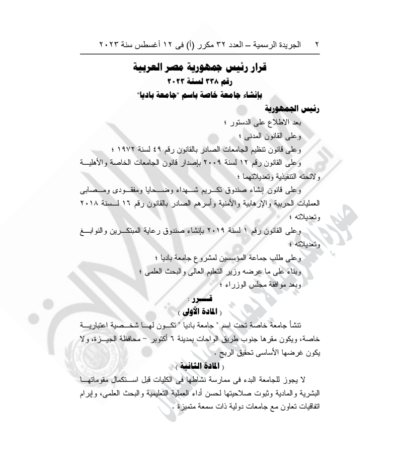 نشرت الجريدة الرسمية في عددها الصادر اليوم الثلاثاء 22 أغسطس الجاري، قرار رئيس الجمهورية رقم 338 لسنة 2023 بإنشاء جامعة خاصة باسم"جامعة باديا"، ومقرها جنوب طريق الواحات بمدينة 6 أكتوبر بمحافظة الجيزة.