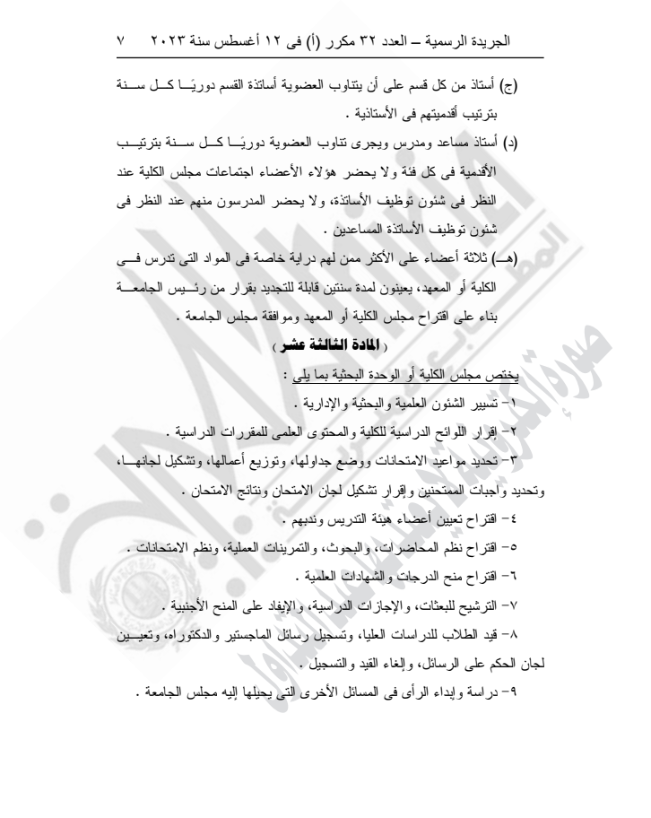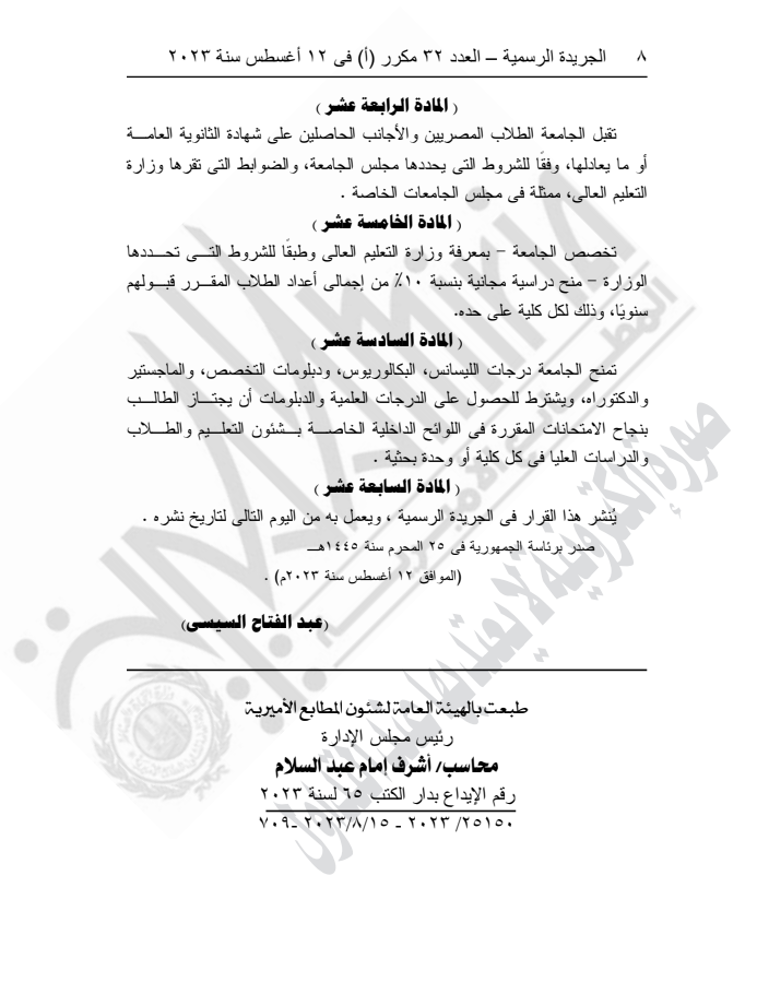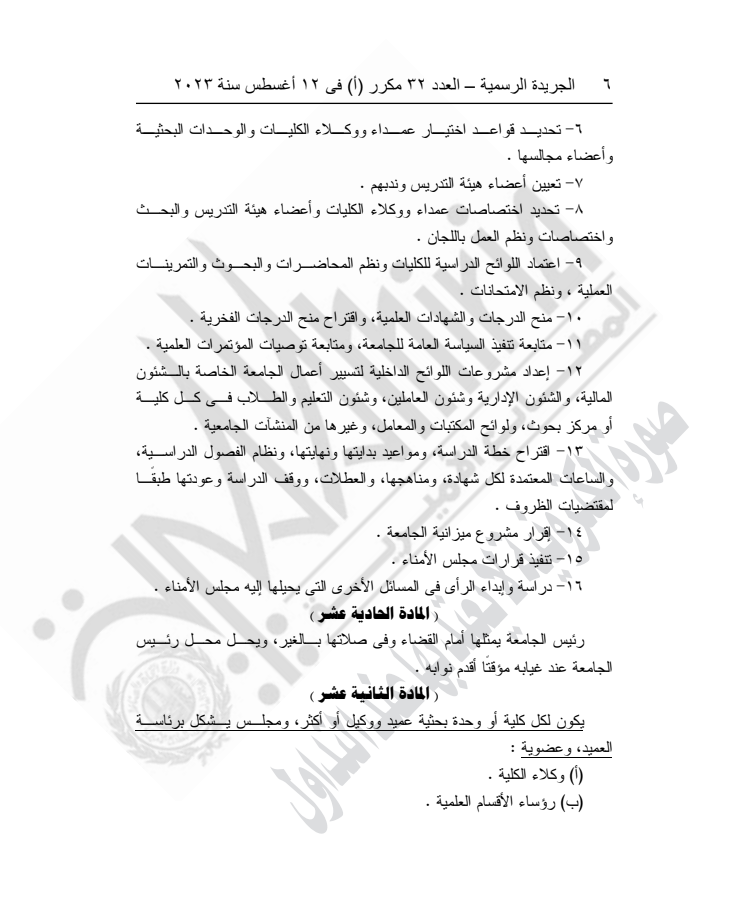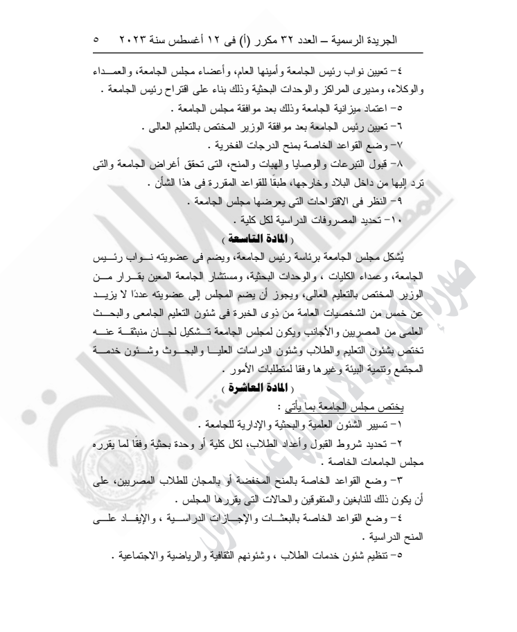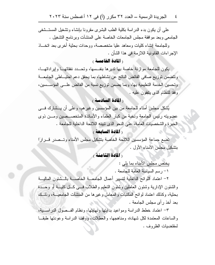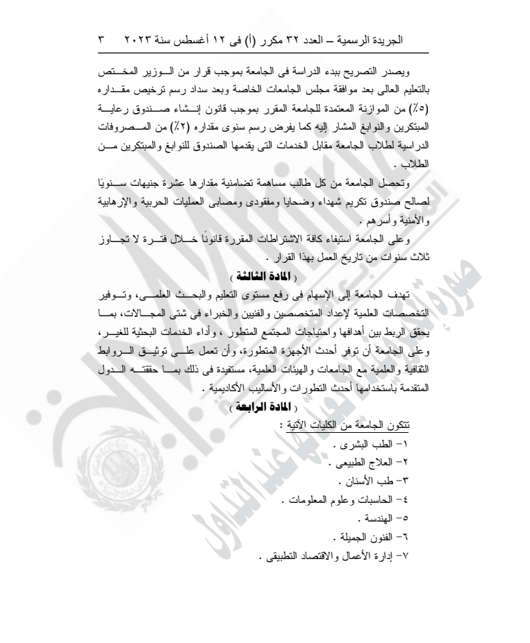 ونص القرار على أنه لا يجوز للجامعة البدء في ممارسة نشاطها في الكليات قبل استكمال مقوماتها البشرية والمادية وثبوت صلاحيتها لحسن أداء العملية التعليمية والبحث العلمي، وإبرام اتفاقيات تعاون مع جامعات دولية ذات سمعة متميزة.