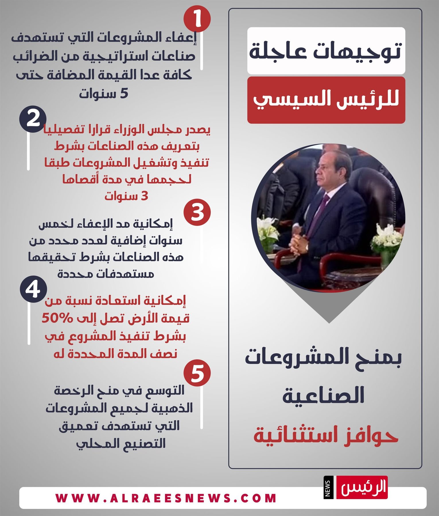 وجه الرئيس عبد الفتاح السيسي الحكومة بمنح المشروعات الصناعية المستهدفة حزمة الحوافز الآتية، وفقًا للضوابط التي يقرها مجلس الوزراء: