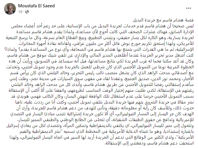 مصطفى السعيد، كشف في منشور عبر صفحته على موقع التواصل الاجتماعي “فيس بوك” عن تلقي جريدة البديل مساعدة مالية بشيك موقع من هشام قاسم، وهو ما اعتبره تمويلا أجنبيا، قدم على أثره استقالته، مشيرا إلى أن التمويل كان يهدف إلى تحويل مسار الجريدة إلى اليسار النيوليبرالي والتصدي للهجوم على إسرائيل.
