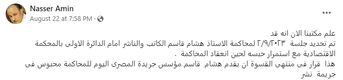 وكانت المحكمة الاقتصادية، حددت جلسة 2 سبتمبر المقبل، لنظر القضية المتهم فيها قاسم بالاعتداء لفظيًا على ضباط بقسم شرطة السيدة زينب، فضلًا عن سب وقذف وزير القوى العاملة الأسبق، كمال أبو عيطة، بحسب المحامي ناصر أمين.