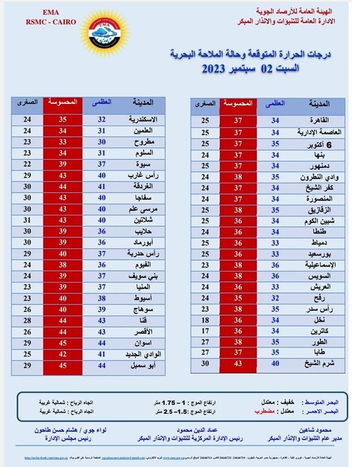 وفيما يلي بيان بدرجات الحرارة المتوقعة اليوم: