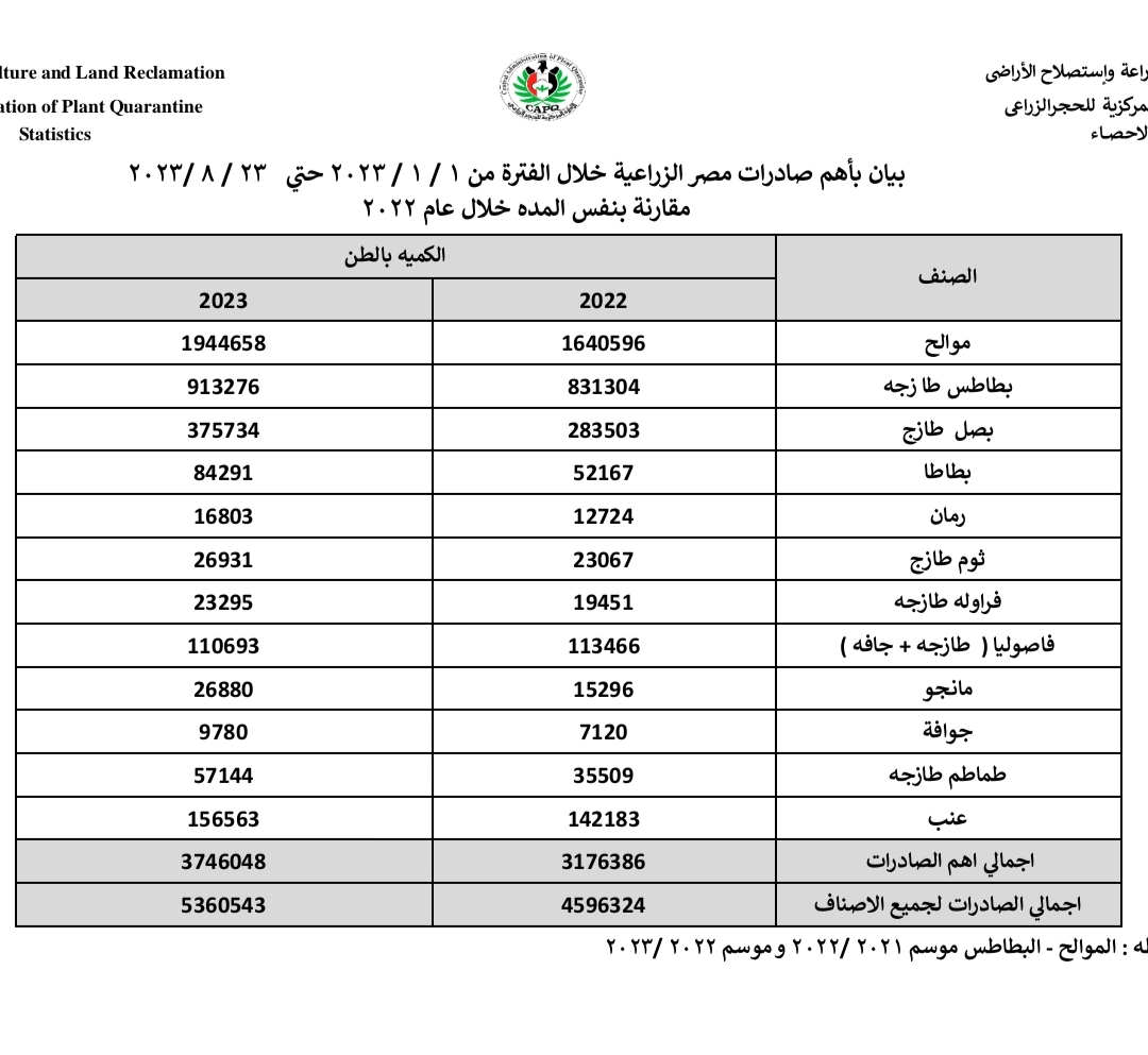 كذلك، بلغ إجمالى الصادرات الزراعية منذ بداية العام الحالي 2023 حتى أغسطس الماضي 5 ملايين و360 ألف طن بينما بلغت عام 2022، 4 ملايين و596 ألف طن.