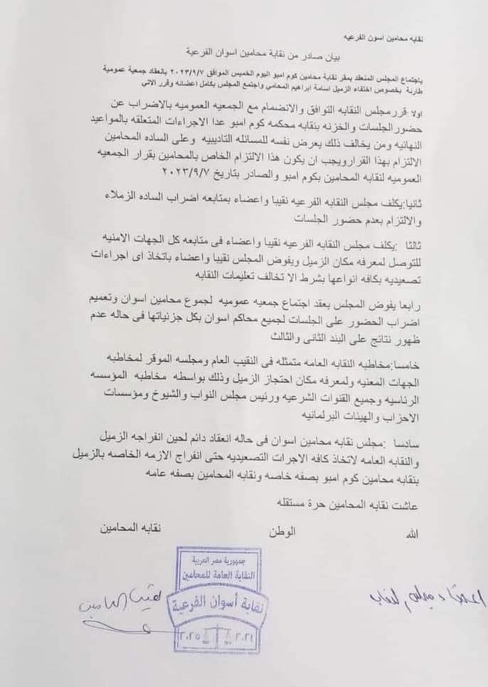 وكانت الجمعية العمومية لمحامين كوم أمبو، أعلنت الخميس الماضي، الإضراب عن حضور الجلسات والدفع فى الخزن بدءًا من السبت، تضامنية مع زميلهم المحامي أسامة إبراهيم الذي تم حبسه 15 يوم على ذمة القضية رقم 2123 لسنة 2023 حصر أمن دولة.