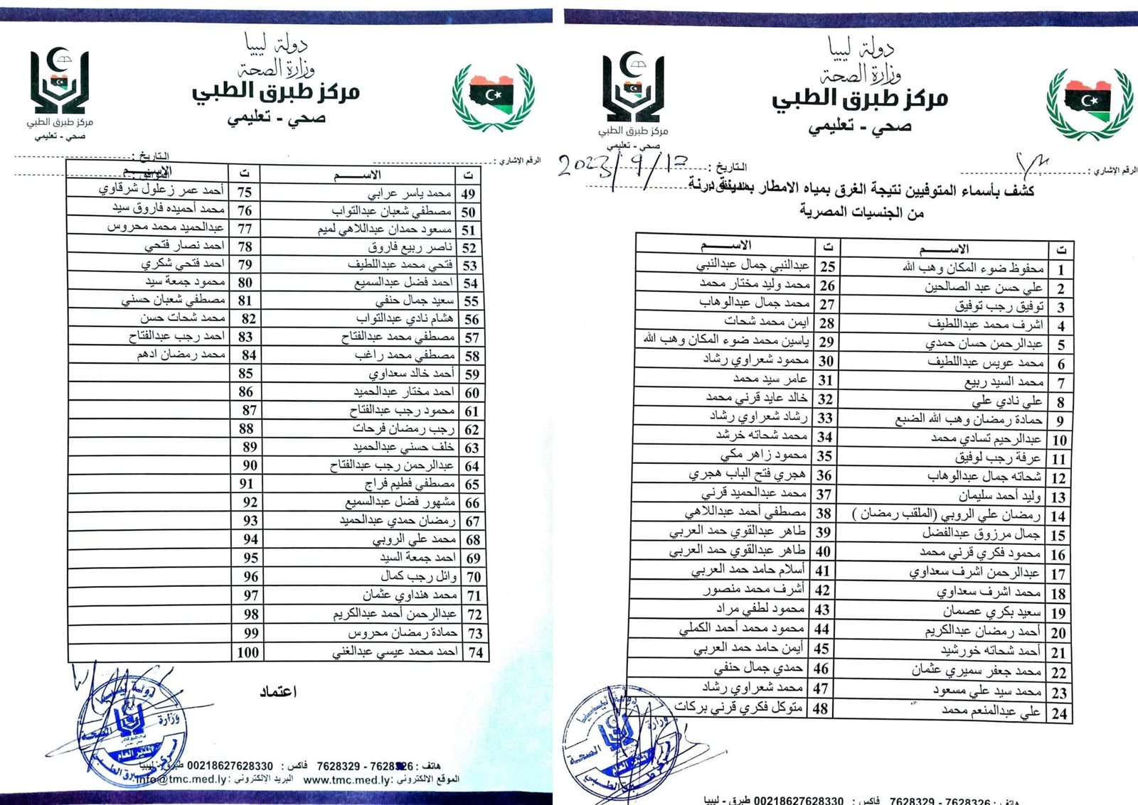 وكشف المركز الطبي بطبرق قائمة بأسماء المصريين المتوفين في مدينة درنة، والذين تم تسليمهم مساء أمس الثلاثاء إلى السلطات المصرية من قبل الجيش الليبي.