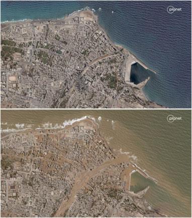 أظهرت صور التقطتها أقمار صناعية قبل وبعد كارثة السيول المدمرة في مدينة درنة، حجم الدمار الذي تسببت به العاصفة "دانيال" في المدينة المنكوبة.