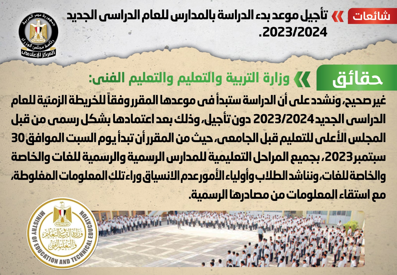 وشددت على أن الدراسة ستبدأ في موعدها المقرر وفقًا للخريطة الزمنية للعام الدراسي الجديد 2023 - 2024 دون تأجيل، وذلك بعد اعتمادها بشكل رسمي من قبل المجلس الأعلى للتعليم قبل الجامعي، حيث من المقرر أن تبدأ يوم السبت الموافق 30 سبتمبر 2023، بجميع المراحل التعليمية للمدارس الرسمية والرسمية للغات والخاصة والخاصة للغات، مناشدة الطلاب وأولياء الأمور عدم الانسياق وراء تلك المعلومات المغلوطة، مع استقاء المعلومات من مصادرها الرسمية.