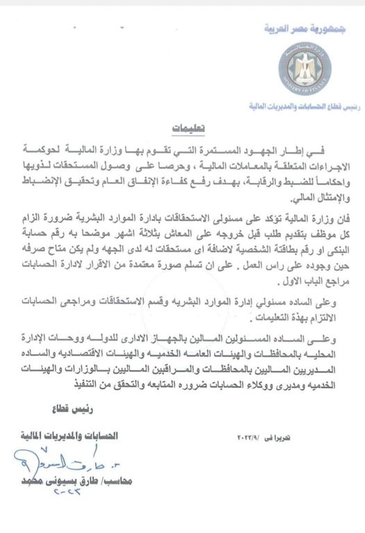أصدر رئيس قطاع الحسابات والمديريات المالية بوزارة المالية قرارًا عامًا بخصوص الموظفين الخارجين على المعاش.