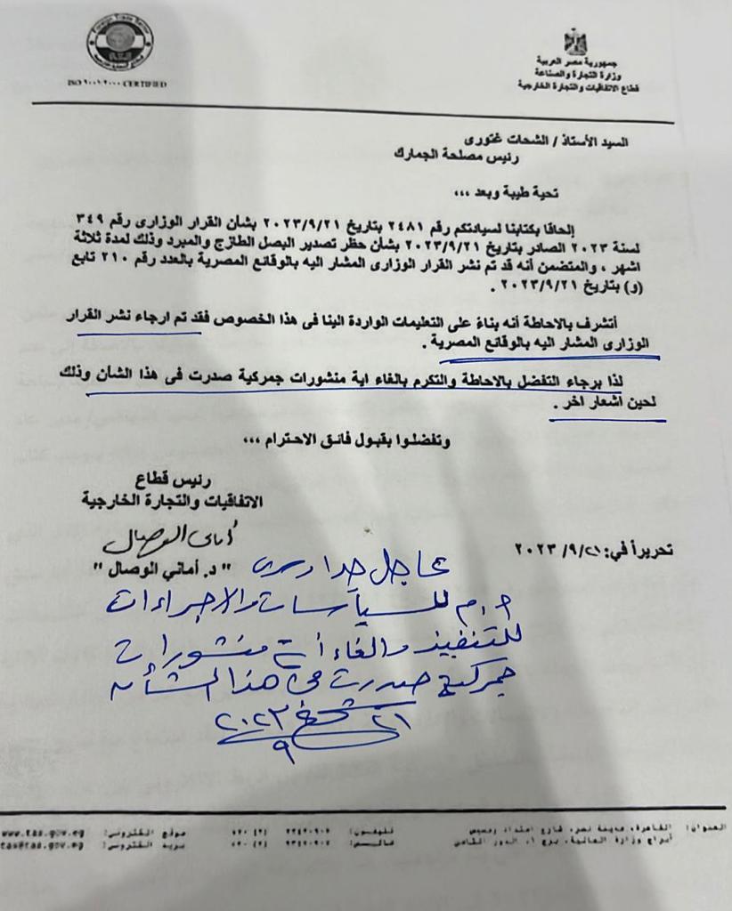 وتضمن المنشور إلغاء منشور 16 لسنة 2023 الصادر من مصلحة الجمارك لجميع المنافذ الجمركية بناء على قرار حظر التصدير والعودة للعمل بالقرارات السابقة عليه.