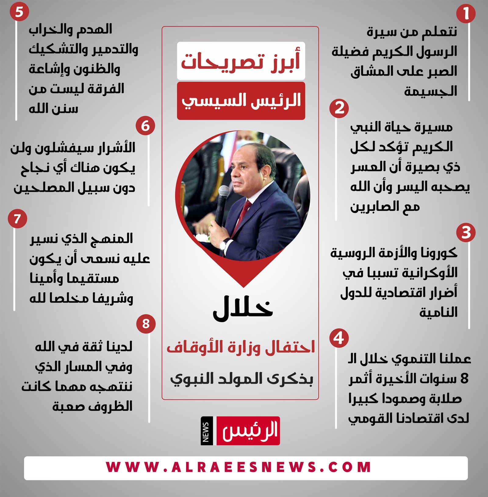 وقال الرئيس السيسي - في كلمته بمناسبة احتفال وزارة الأوقاف بذكرى المولد النبوي الشريف - "إن من سيرة حياة الرسول الكريم نتعلم فضيلة الصبر على المشاق الجسيمة وفي ثناياها وأحداثها.. نرى كيف تعمل أقدار الله.. وكيف يثابر المؤمنون على إيمانهم.. يرعونه بالعمل والإحسان.. حتى يأتي نصر الله القريب، للمخلصين من عباده".