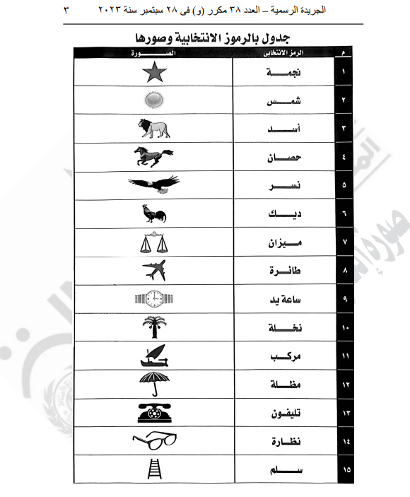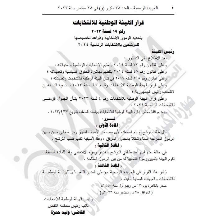 ونشرت الجريدة الرسمية قرار الهيئة الوطنية للانتخابات رقم 19 لسنة 2023 والذى تضمن تحديد الرموز الانتخابية وقواعد تخصيصها للمرشحين بالانتخابات الرئاسية 2024.