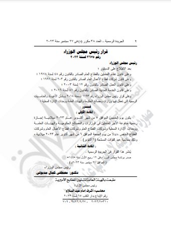 نشرت الجريدة الرسمية قرار رئيس مجلس الوزراء رقم ٣٦٧٥ لسنة ٢٠٢٣، بعد الاطلاع على الدستور ؛ وعلى قانون نظام العاملين بالقطاع العام الصادر بالقانون رقم ٤٨ لسنة ١٩٧٨ ؛ وعلى قانون شركات قطاع الأعمال العام الصادر بالقانون رقم ۲۰۳ لسنة ۱۹۹۱ ؛ وعلى قانون العمل الصادر بالقانون رقم ١٢ لسنة ۲۰۰۳ ؛