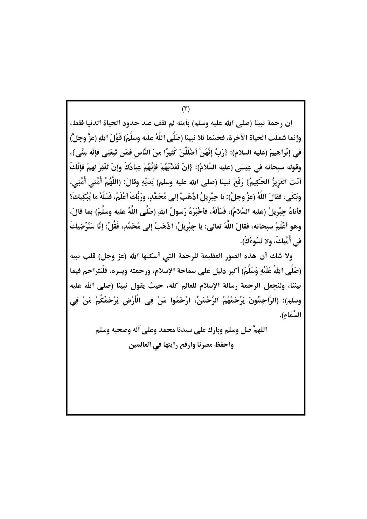 إن رحمة نبينا صلى الله عليه وسلم بأمته لم تقف عند حدود الحياة الدنيا فقط وإنما شملت الحياة الآخرة، فحينما تلا نبينا (صَلَّى اللهُ عليه وسلَّمَ) قَوْلَ اللَّهِ (عز وجل) في إبراهيم (عليه السلام): {رَبِّ إِنَّهُنَّ أَضْلَلْنَ كَثِيرًا مِنَ النَّاسِ فَمَن تَبِعَنِي فَإِنَّهُ مِنِّي وقوله سبحانه في عيسى عليه السَّلام): {إِنْ تُعَذِّبُهُمْ فَإِنَّهُمْ عِبادَكَ وإِنْ تَغْفِرْ لهمْ فَإِنَّكَ أنتَ العَزِيزُ الحَكِيمُ رَفَعَ نبينا صلى الله عليه وسلم يَدَيْهِ وَقَالَ: اللَّهُم أُمَّتِي أُمَّتِي، ویکی فقال الله عزّ وجلَّ) یا جِبْرِيلُ اذْهَبْ إِلى مُحَمَّدٍ، ورَبُّكَ أَعْلَمُ فَسَلْهُ ما يُبْكِيكَ؟ فأتاه جبريل (عليه السلام)، فَسَأَلَهُ، فَأَحْبَرَهُ رَسُولُ اللهِ صَلَّى اللهُ عليهِ وسلَّمَ بما قال، وهو أَعْلَمُ سبحانه، فقال الله تعالى يا جِبْرِيلُ اذْهَبْ إِلى مُحَمَّدٍ، فَقُلْ إِنَّا سَتَرْضِيكَ أُمَّتِكَ، ولا نَسُوءك). ولا شك أن هذه الصور العظيمة للرحمة التي أسكنها الله (عز وجل) قلب نبيه (صَلَّى اللهُ عَلَيْهِ وَسَلَّمَ أكبر دليل على سماحة الإسلام ورحمته ويسره فلنتراحم فيما | بيننا، ولنجعل الرحمة رسالة الإسلام للعالم كله حيث يقول نبينا صلى الله عليه وسلم): (الرَّاحِمُونَ يَرْحَمُهُمْ الرَّحْمَنُ ارْحَمُوا مَنْ فِي الْأَرْضِ يَرْحَمُكُمْ مَنْ فِي في السَّمَاء)، اللهم صل وسلم وبارك على سيدنا محمد وعلى آله وصحبه وسلم واحفظ مصرنا وارفع رايتها في العالمين".