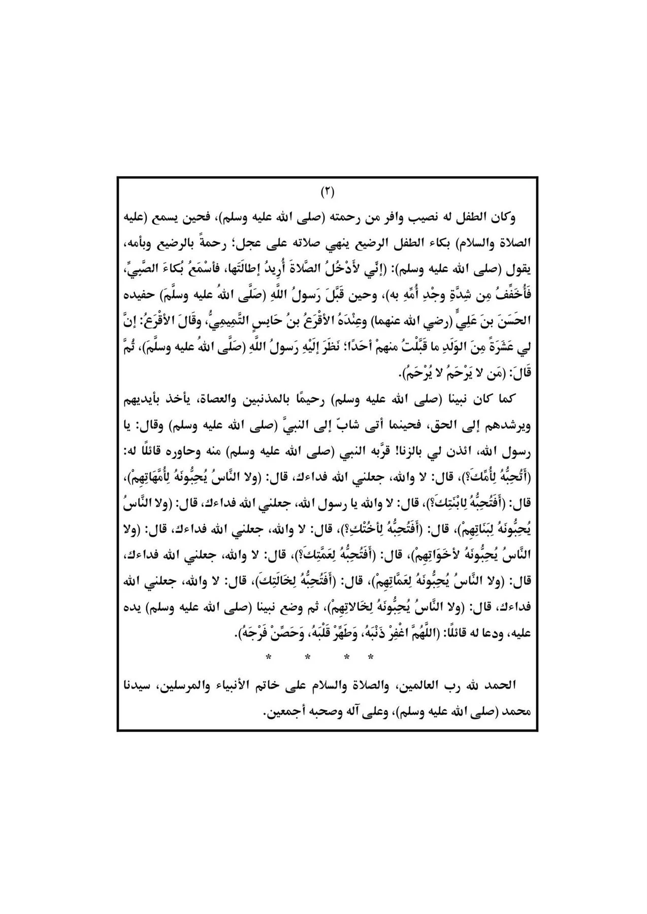 وكان الطفل له نصيب وافر من رحمته صلى الله عليه وسلم، فحين يسمع عليه الصلاة والسلام، بكاء الطفل الرضيع ينهي صلاته على عجل رحمة بالرضيع وبأمه يقول (صلى الله عليه وسلم): (إنّي لأَدْخُلُ الصَّلاةَ أُرِيدُ إطالتها، فَأَسْمَعُ بُكاء الصبي شِدَّةِ وجدِ أُمَّهِ به وحين قَبْلَ رَسولُ اللهِ صَلَّى الله عليه وسلَّمَ) حفيده الحَسَنَ بنَ عَلِيٍّ (رضي الله عنهما) وعِنْدَهُ الأَقْرَعُ بن حابس ال التَّمِيمِيُّ، وقَالَ الأَقْرَعُ: إن لي عَشَرَةً مِنَ الوَلَدِ مَا قَبَّلْتُ منهمْ أَحَدًا؛ نَظَرَ إِلَيْهِ رَسولُ اللهِ صَلَّى الله عليه وسلَّم)، ثُمَّ فَأَخَفِّفُ مِن قَالَ: (مَن لا يَرْحَمُ لا يُرْحَمُ). كما كان نبينا صلى الله عليه وسلم رحيما بالمذنبين والعصاة يأخذ بأيديهم ويرشدهم إلى الحق، فحينما أتى شاب إلى النبي (صلى الله عليه وسلم) وقال: يا رسول الله ائذن لي بالزنا قربه النبي (صلى الله عليه وسلم منه وحاوره قائلا له: (أَتُحِبُّهُ لِأُمَّكَ؟)، قال: لا والله، جعلني الله فداءك، قال: (ولا النَّاسُ يُحِبُّونَهُ لِأُمَّهَاتِهِمْ)، قال: (أَفَتُحِبُّهُ لِابْنَتِكَ؟)، قال: لا والله يا رسول الله، جعلني الله فداءك، قال: (ولا النَّاسُ | يُحِبُّونَهُ لِبَنَاتِهِمْ)، قال: (أَفَتُحِبُّهُ لِاخْتُكِ؟)، قال: لا والله، جعلني الله فداءك، قال: (ولا | النَّاسُ يُحِبُّونَهُ لأَخَوَاتِهِمْ) قال: (أَفَتُحِبُّهُ لِعَمَّتِكَ؟ قال: لا والله، جعلني الله فداءك، قال: (ولا) النَّاسُ يُحِبُّونَهُ لِعَمَّاتِهِمْ)، قال: (أَفَتُحِبُّهُ لِخَالَتِك، قال: لا والله، جعلني الله فداءك، قال: ولا) النَّاسُ يُحِبُّونَهُ لِخالاتهم، ثم وضع نبينا صلى الله عليه وسلم يده عليه، ودعا له قائلا: (اللَّهُمَّ اغْفِرْ ذَنْبَهُ، وَطَهِّرْ قَلْبَهُ، وَحَصِّنْ فَرْجَهُ).