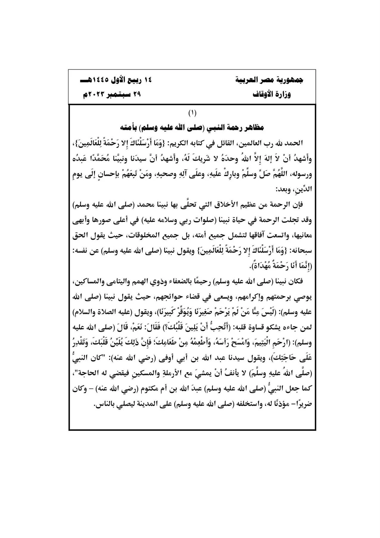 ومن جانبها، حددت وزارة الأوقاف، موضوع خطبة الجمعة اليوم، في جميع المساجد التابعة لها على مستوى الجمهورية بعنوان "مظاهر رحمة النبي صلى الله عليه وسلم بأمته"؛ تزامنا مع استقبال شهر ربيع الأول وتحديدًا 14 ربيع الأول لعام 1445هـ؛ شهر مولد النبي الكريم محمد صلى الله عليه وسلم.