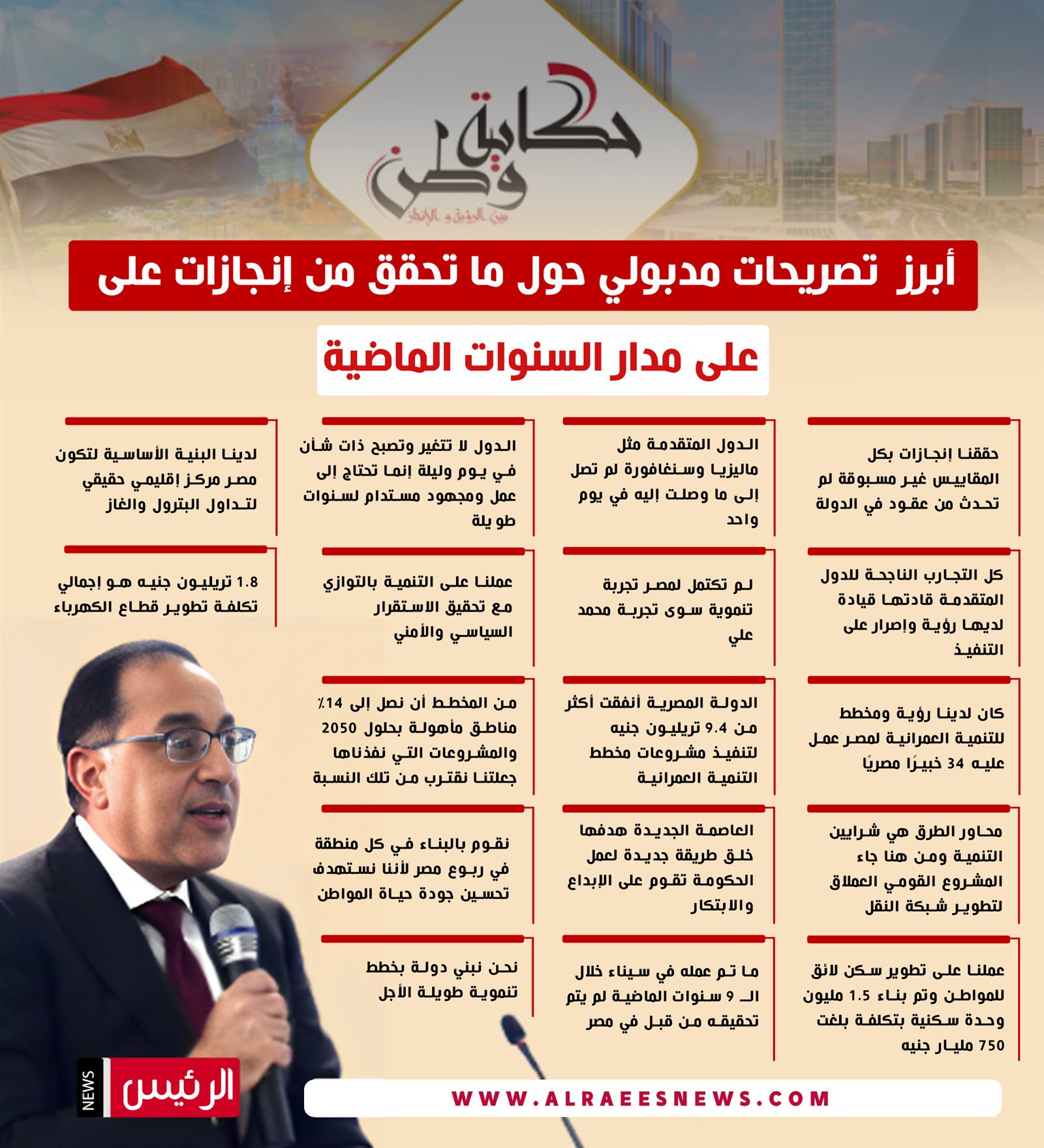 تحدث الدكتور مصطفى مدبولي، رئيس مجلس الوزراء، خلال كلمته في مؤتمر حكاية وطن، وبحضور الرئيس السيسي، عن تطوير تنمية الدولة المصرية، خلال الـ 9 سنوات الماضية، وشمل الحديث كافة المجالات، بداية من الاقتصاد وحتى الغذاء والرعاية الصحية.