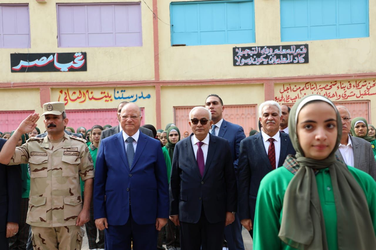 وفي مستهل زيارتهما للمدرسة، حضر الدكتور رضا حجازى واللواء خالد عبد العال طابور الصباح وتحية العلم، وقدما التهنئة لجميع الطالبات والمعلمين والعاملين بالمدرسة بالعام الدراسى الجديد، متمنين لهم عاما دراسيا موفقا.