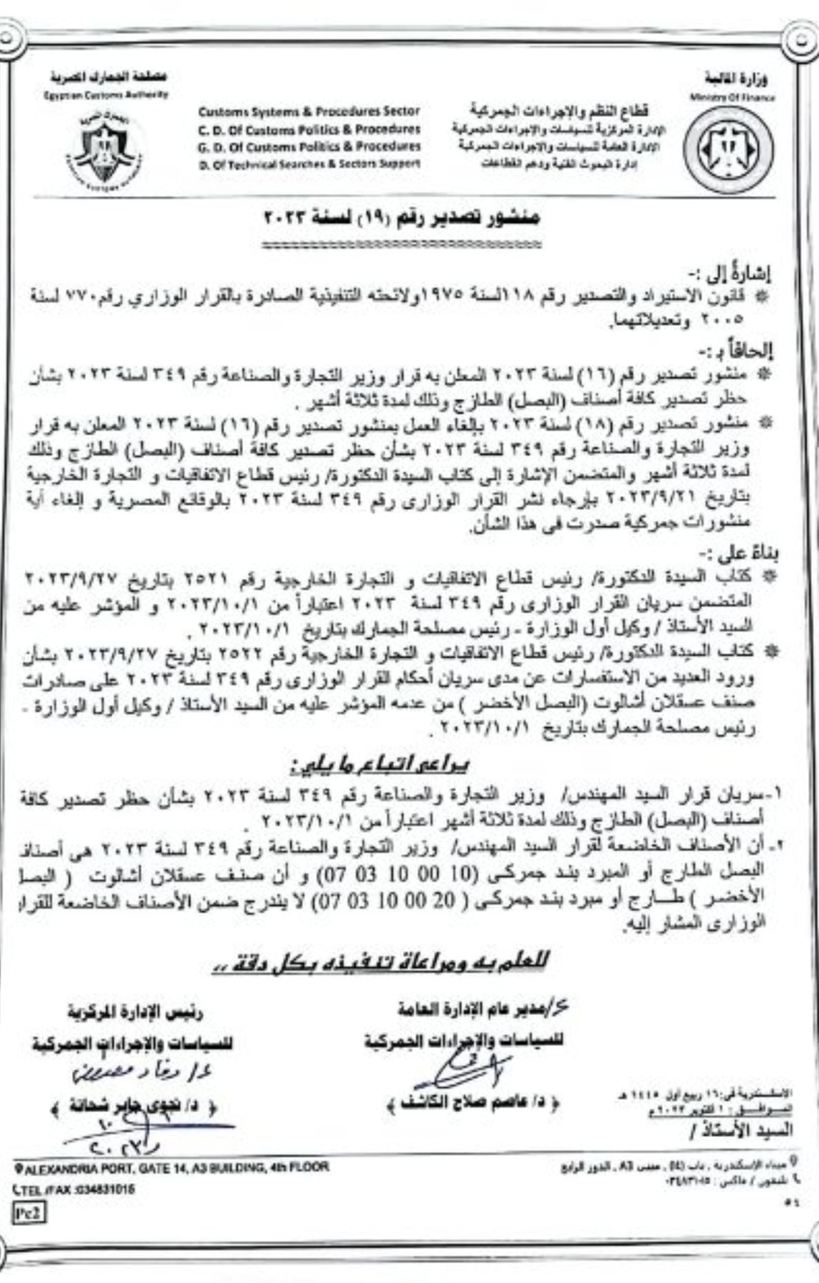 بدأت المنافذ الجمركية تنفيذ قرار وزير التجارة والصناعة رقم ٣٤٩ لسنة ۲۰۲۳ بشأن حظر تصدير كافة أصناف (البصل) الطازج لمدة ثلاثة أشهر.