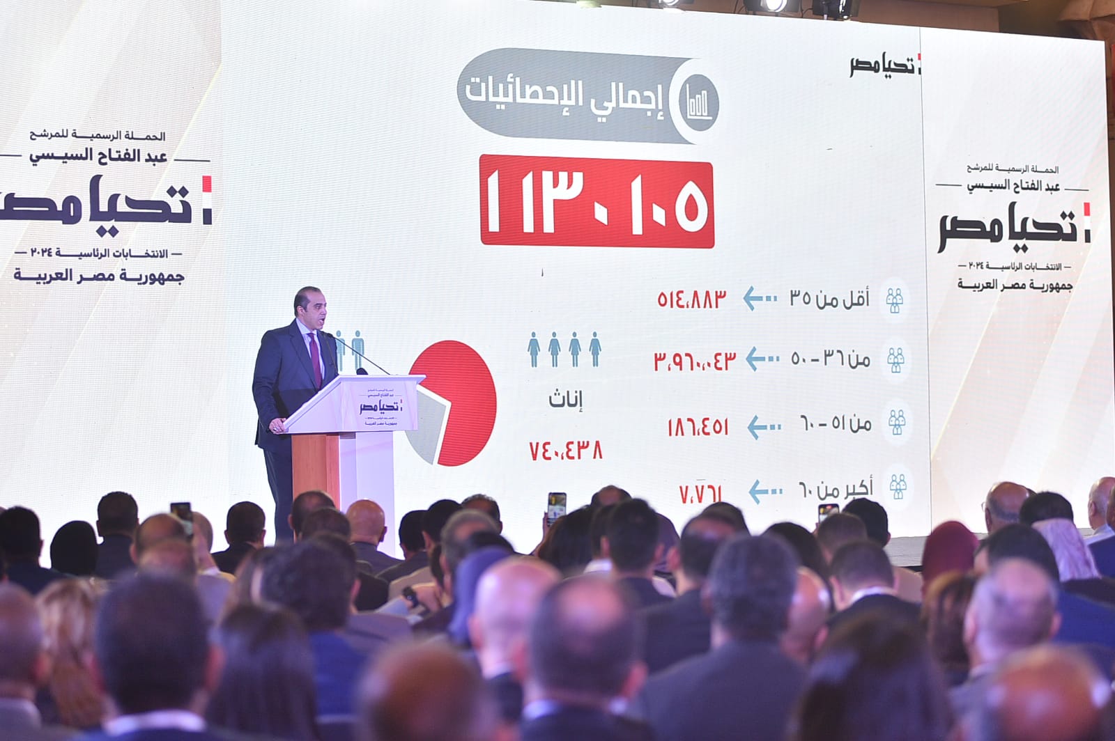 وأكد المستشار محمود فوزي، وكيل الحملة الانتخابية الرسمية للمرشح الرئاسي عبدالفتاح السيسي، في الانتخابات الرئاسية 2024، أن التأييد من سن 36 إلى سنة 50 عاما كان 396 ألف تأييد، والفئة العمرية من سن 51 عاما إلى 60 عاما 186 ألف تأييد، والفئة العمرية فوق الـ 60 عاما قرابة 7 آلاف تأييد.