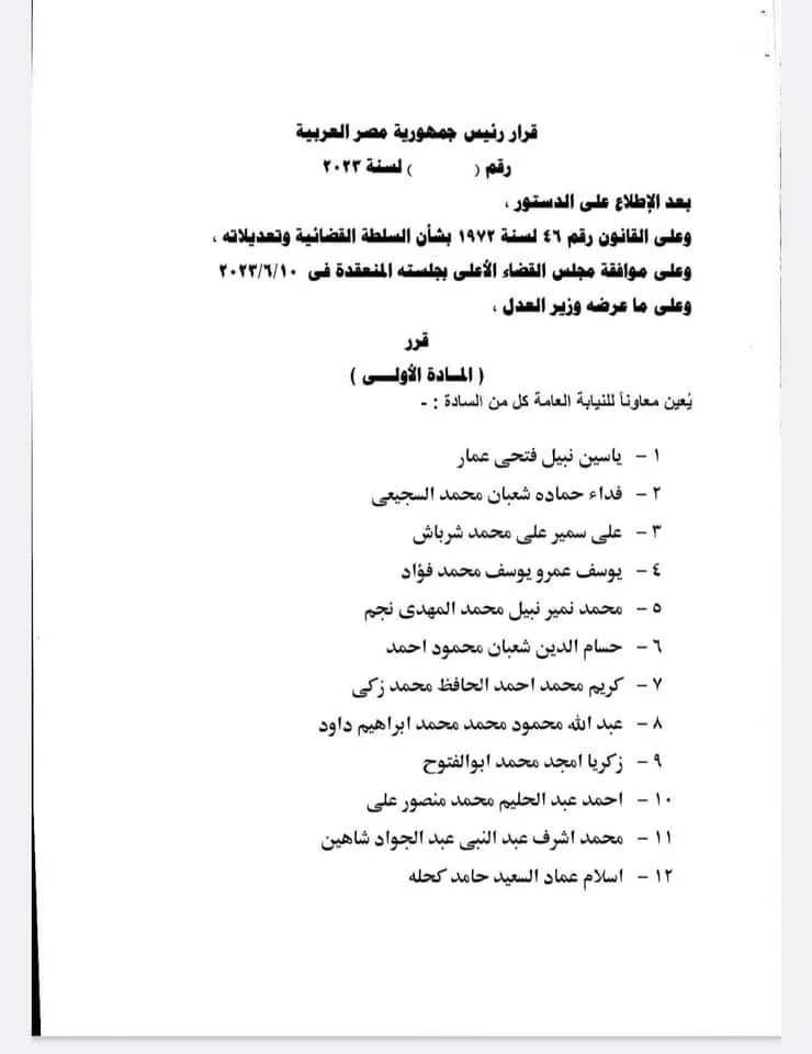 وبدورها، نشرت الجريدة الرسمية في عددها الصادر 8 أكتوبر 2023، قرار رئيس الجمهورية بتعيين معاوني النيابة العامة، والذي جاء بعد الإطلاع على الدستور؛ وعلى القانون رقم 46 لسنة 1972 بشأن السلطة القضائية؛ وموافقة مجلس القضاء الأعلى، وعلى ما عرضه وزير العدل.