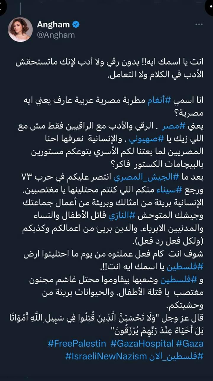 وقالت أنغام عبر «تويتر»: «انت يا اسمك ايه!! بدون رقي ولا أدب لإنك ماتستحقش الأدب في الكلام ولا التعامل، أنا اسمي أنغام مطربة مصرية عربية عارف يعني إيه مصرية؟ يعني مصر. الرقي والأدب مع الراقيين فقط مش مع اللي زيك يا صهيوني. والإنسانية نعرفها إحنا المصريين لما بعتنا لكم الأسرى بتوعكم مستورين بالبيچامات الكستور فاكر؟».