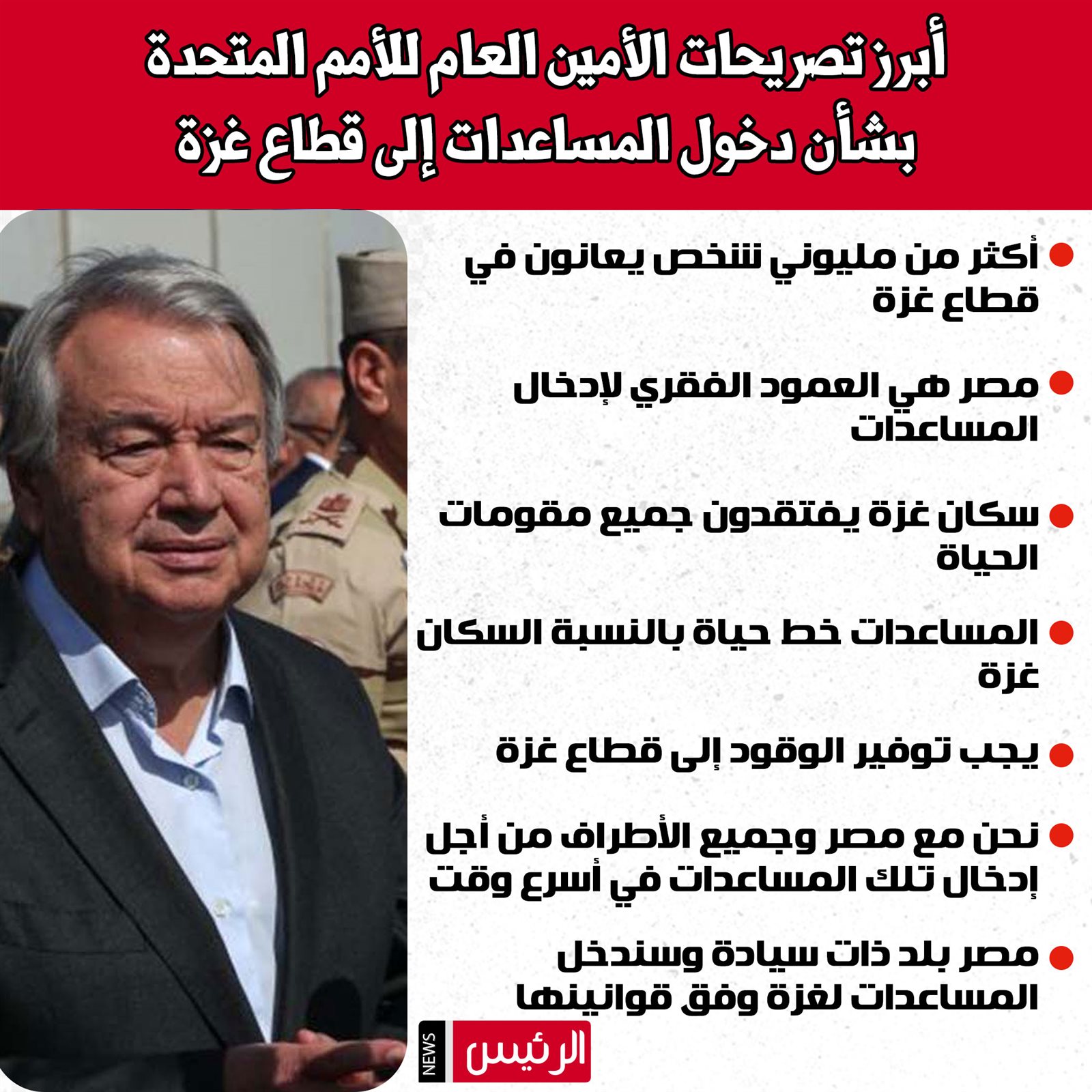 وقال الأمين العام للأمم المتحدة، إن مصر بلد ذات سيادة ويجب الإقرار بالقوانين المصرية، وسندخل المساعدات لغزة وفق قوانينها.