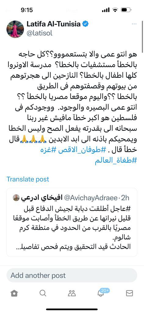 وأردفت لطيفة: "واليوم موقعا مصريا بالخطأ؟؟، انتو عمي البصيره والوجود، ووجودكم فى فلسطين هو أكبر خطأ، مافيش غير ربنا سبحانه اللى بقدرته يفعل الصح وليس الخطأ، ويمحيكم بإذنه إلى أبد الآبدين".