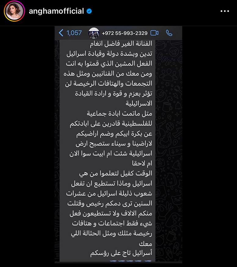وسبق أن كتبت أنغام تغريدة تهاجم فيها المتحدث باسم جيش الاحتلال، قائلة: "ربنا ياخدك ويريحنا من وشك"، لينتقد أفيخاى طريقتها ويهاجمها فى تغريدة بحسابه على "إكس".