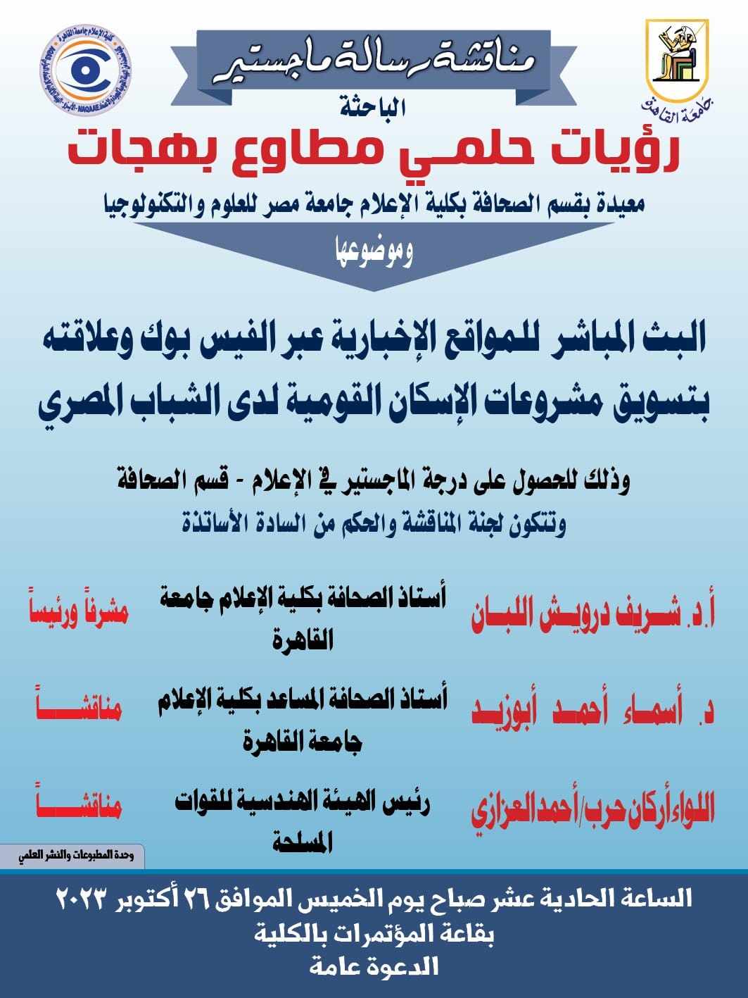 تناقش كلية الإعلام جامعة القاهرة، الخميس المقبل، رسالة ماجستير للباحثة رؤيات حلمي مطاوع بهجات، معيدة بقسم الصحافة بكلية الإعلام جامعة مصر للعلوم والتكنولوجيا، بعنوان "البث المباشر للمواقع الإخبارية عبر الفيس بوك وعلاقته بتسويق مشروعات الإسكان القومية لدى الشباب المصري".