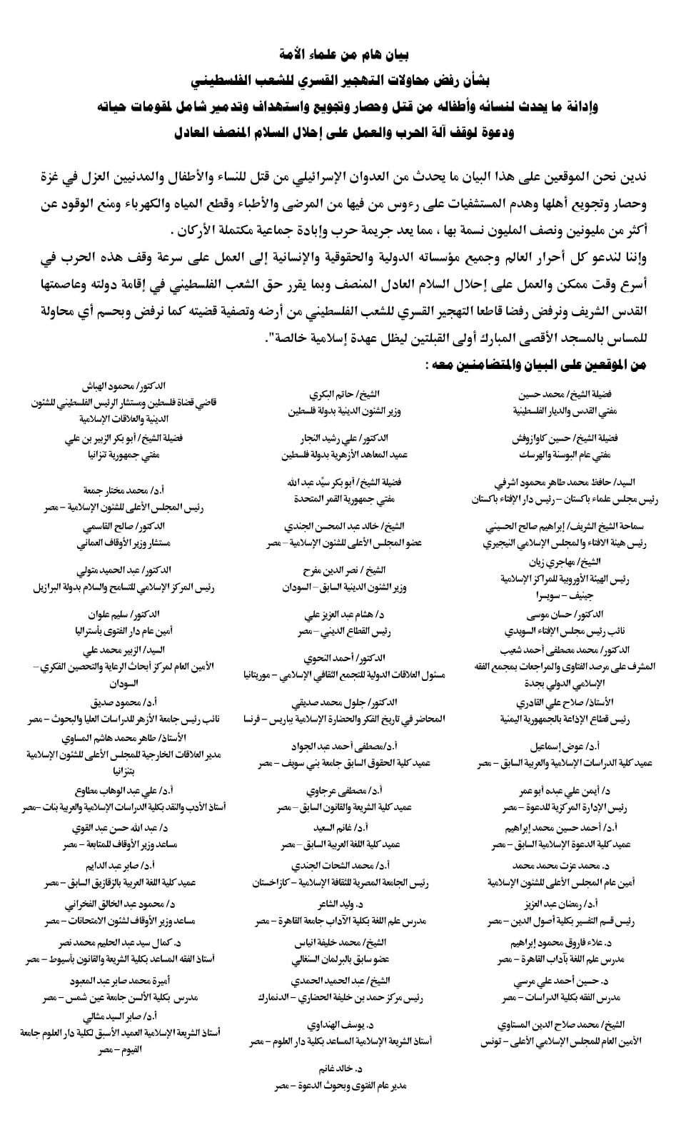 بيان عاجل من علماء الأمة ردا على محاولات التهجير القسري للشعب الفلسطيني