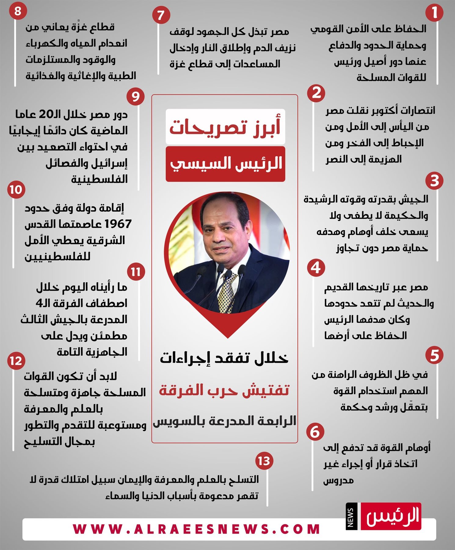 وجاءت أبرز تصريحات الرئيس السيسي خلال اصطفاف تفتيش حرب الفرقة الرابعة المدرعة بالجيش الثالث الميداني بالسويس: